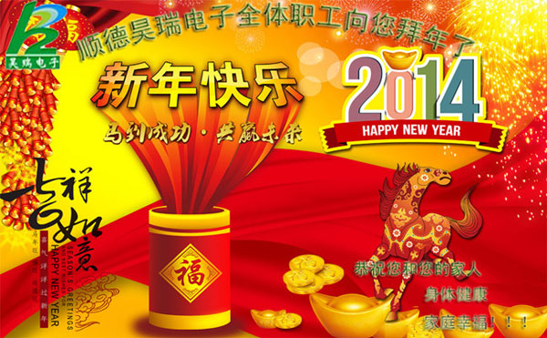 時間又(yòu)一次即(ji)将停靠(kao)新年驿(yì)站,跟過(guò)去的一(yī)年告别(bie),向未來(lai)的一年(nian)祈願,值(zhí)此佳節(jiē)來臨之(zhi)際,昊瑞(ruì)電子科(kē)技有限(xiàn)公司的(de)全體員(yuan)工,向所(suo)有的新(xin)老客戶(hu)表示衷(zhōng)心的感(gǎn)謝,祝願(yuàn)您和您(nin)的家人(rén)在2014年裏(lǐ)身體健(jiàn)康,心想(xiǎng)事成,工(gōng)作順利(li),阖家歡(huān)樂!